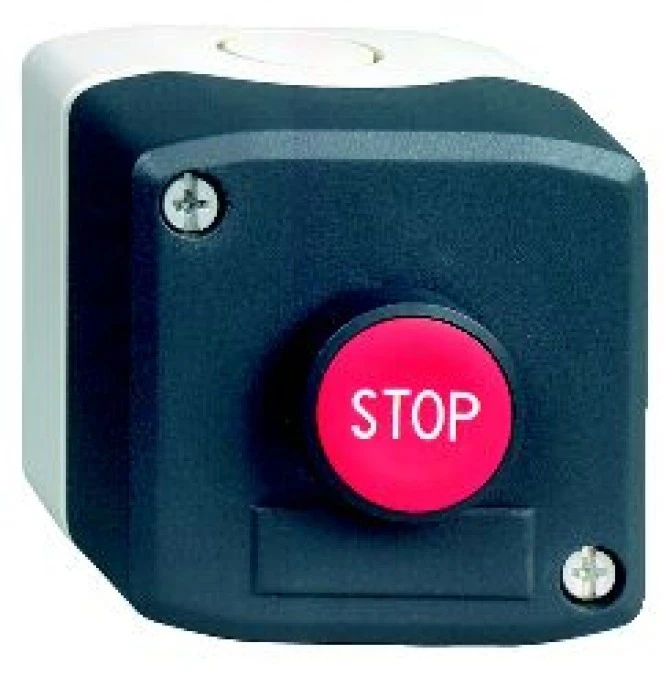 17. Kaseta ciemnoszara, 1 czerw. przycisk kryty O22, z sam. powr., 1NC Stop XALD114 122.04