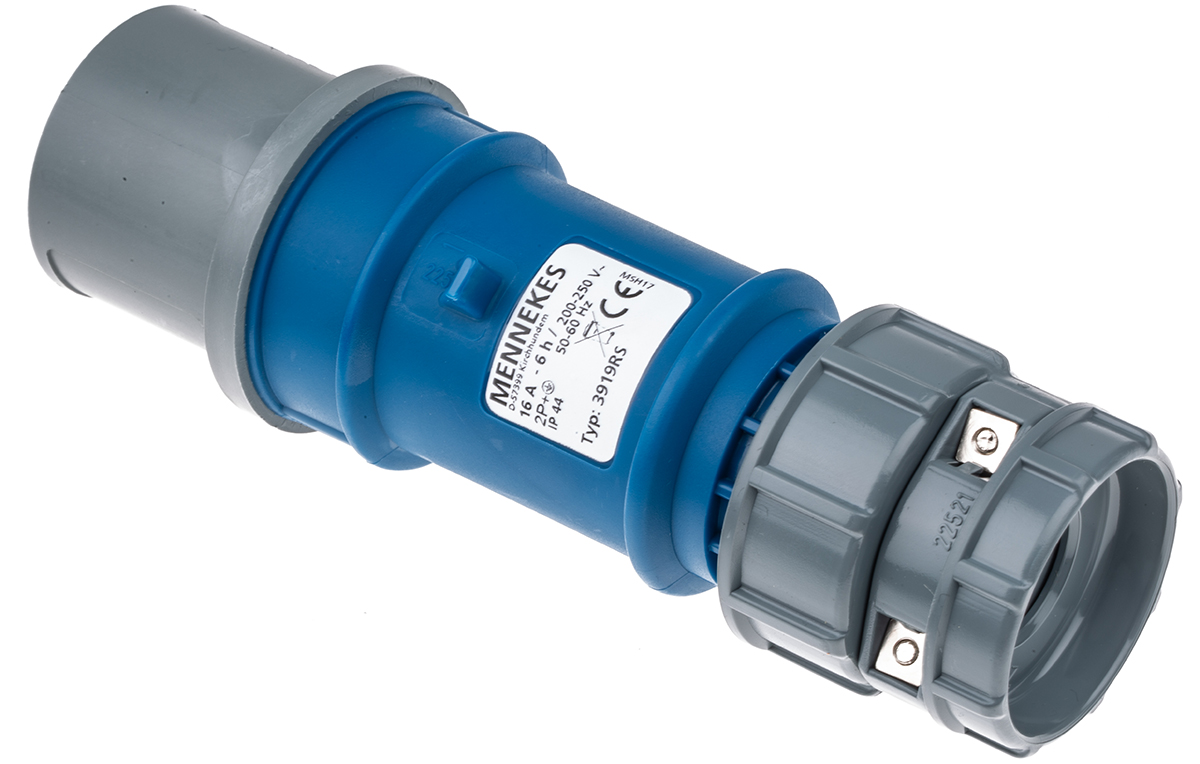 5. Złącze przemysłowe - zasilające 16A Wtyczka 230 V 3P Męski MENNEKES Niebieski Montaż na kablu IP44 100.11