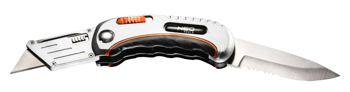 14. Nóż uniwersalny składany, ostrze trapezowe + nóż, nylonowe etui + 5 ostrzy Neo 63-710 71.89