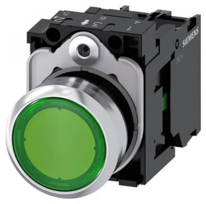 8. Przycisk 22 mm, round, metal, shiny, green, pushbutton, flat, momentary contact type, with holder, 1 NO, LED modu 77.28