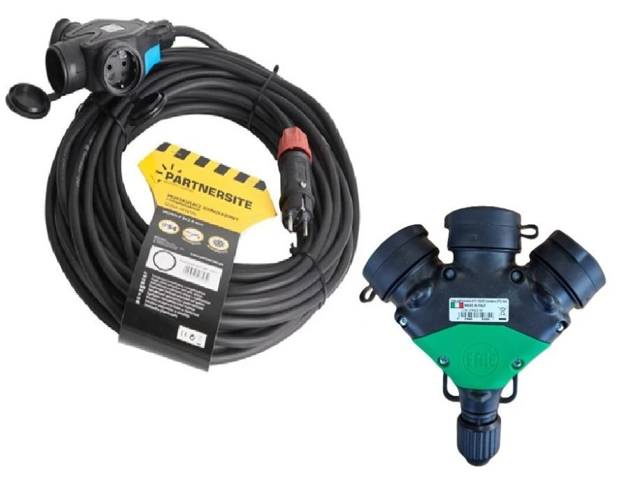 9. Przedłużacz jednofazowy 50m z rozgałęźnikiem 3-gniazdowym, przewód H07RN-F 3x2,5mm2 IP44 17073 637.61
