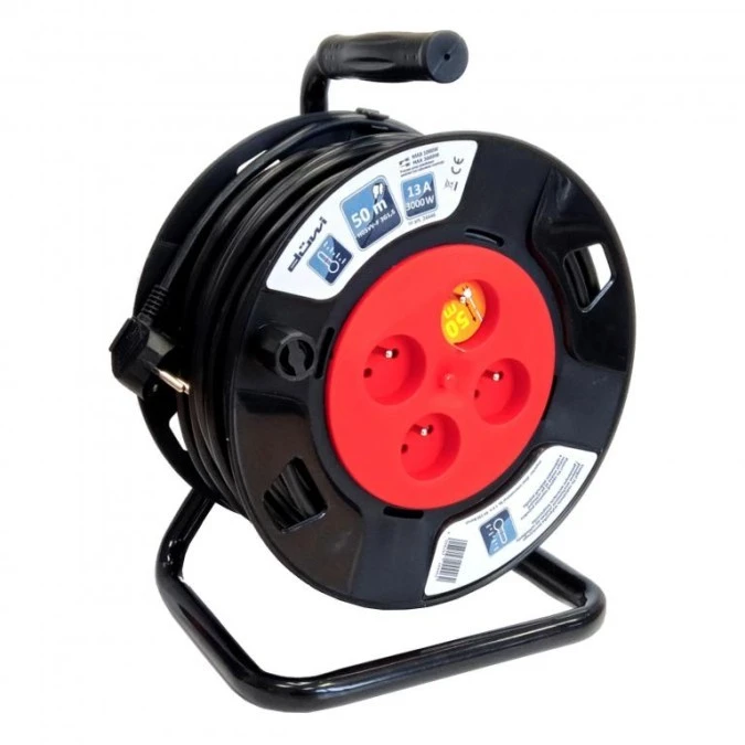 Przedłużacz bębnowy 50m OWY H05VV-F 3x1,5 z zabezpieczeniem termicznym, czarno-czerwony 24446