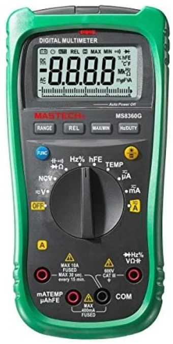 7. Miernik cyfrowy multimetr V AC, V DC, 0-10A DC, 0-10A AC, oporność, pojemność, opór, częstotliwość, temperatura, cykle MS-8360G 328.63