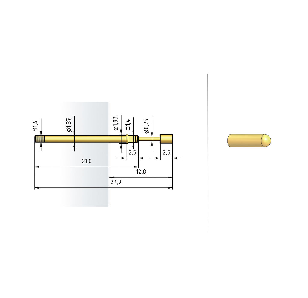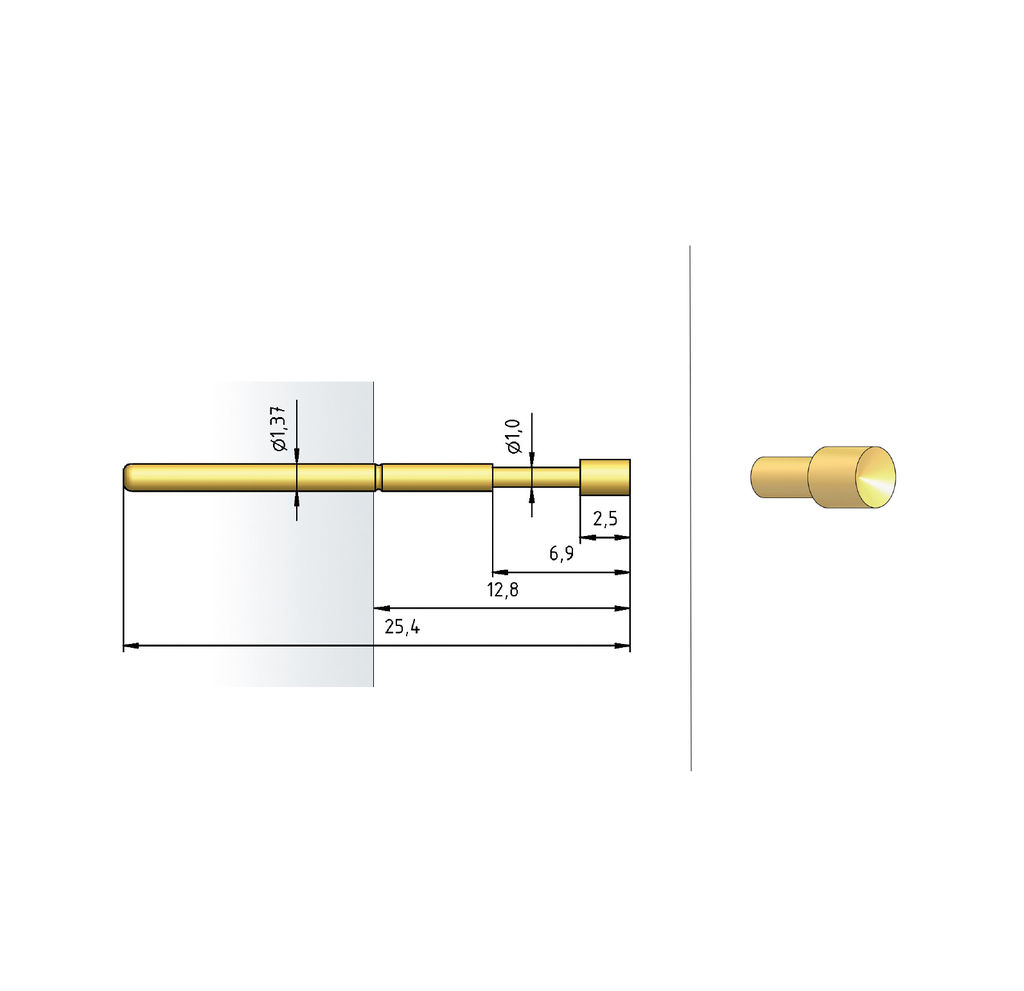 1. ICT spring contact with probe, tip, Ø 1.37 mm, travel  10 mm, pitch 2.54 mm, L 37 mm, 1034/E-B-1.5N-AU-0.9 14.72 x50
