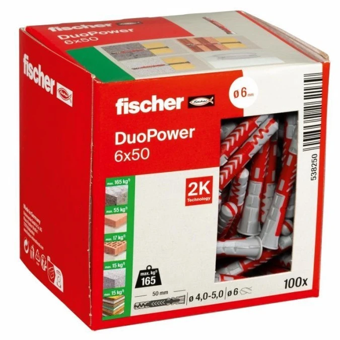 8. Kołki rozporowe uniwersalne DuoPower 6x50mm 2-składnikowe do wszystkich typów podłoża FISCHER 100szt 49.78