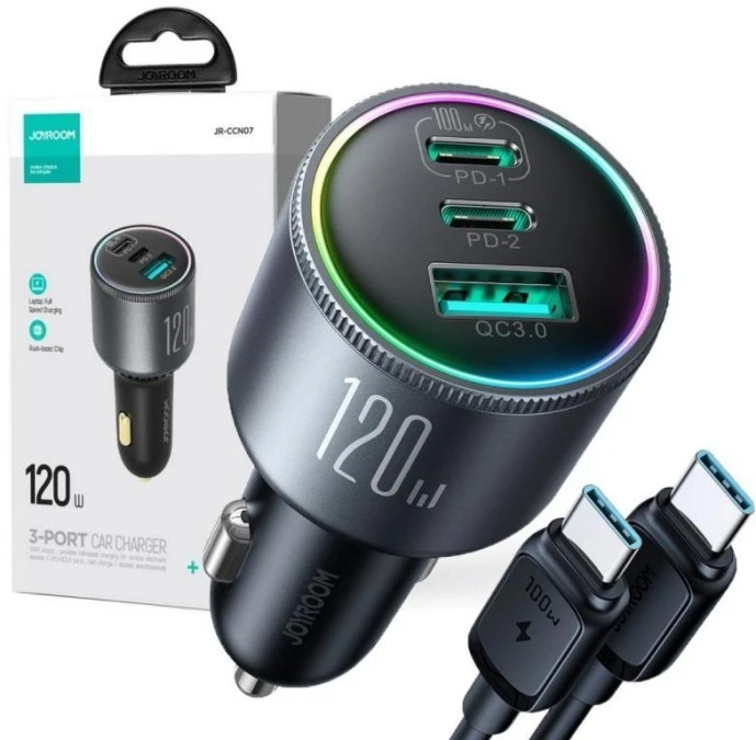 Ładowarka samochodowa Joyroom JR-CCN07 120W 5.0A PD 3.0 QC 3.0 1x USB-A 2x USB-C + kabel
