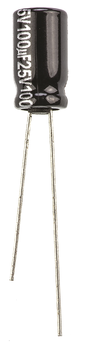 13. Aluminiowy kondensator elektrolityczny 100μF 25V dc Radialny, Otwór przelotowy Panasonic roztaw: 2.5mm 6.3 (Dia.) x 1.75 x5