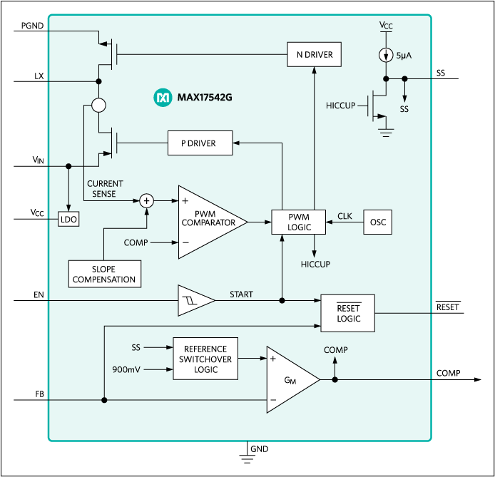 15. 4.5V–42V, 5A, High-Efficiency, Synchronous Step-Down DC-DC Converter with Internal Compensation Sample