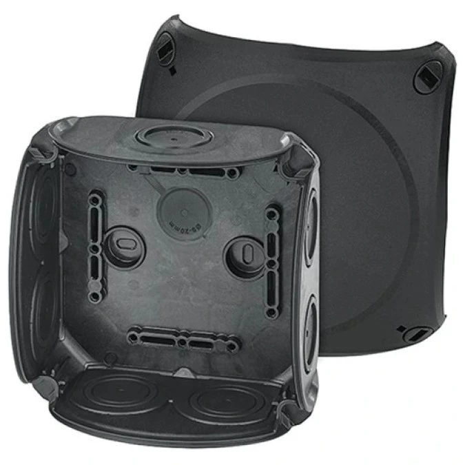 1. Puszka instalacyjna KF 0200 B natynkowa bez zacisków z linką łączącą pokrywę z podstawą 104x104x70mm hermetyczna IP66 czarna HEN 80.57