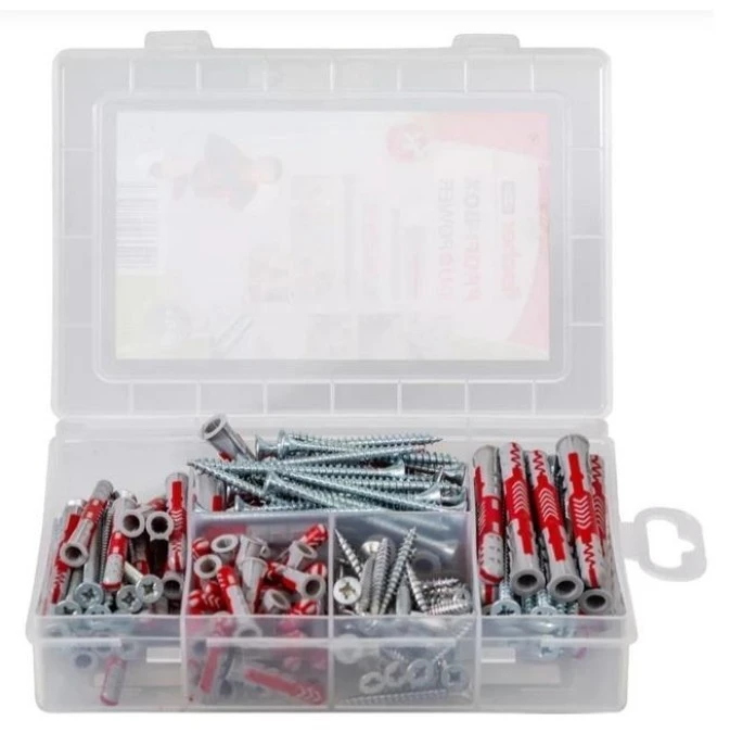 10. MIX Kołki rozporowe uniwersalne w pudełku DuoPower 6x30, 6x50, 8x40, 8x65 z wkrętem z łbem stożkowym PZ 150 elementów PROFI-BOX 84.91