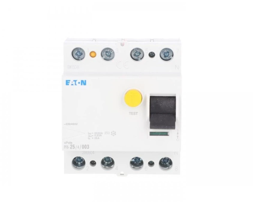 1. Wyłącznik różnicowoprądowy PF6 3-fazowy 63A 30mA typ A 4-biegunowy 4P (400V AC) 4-modułowy EATON 286512 243.00