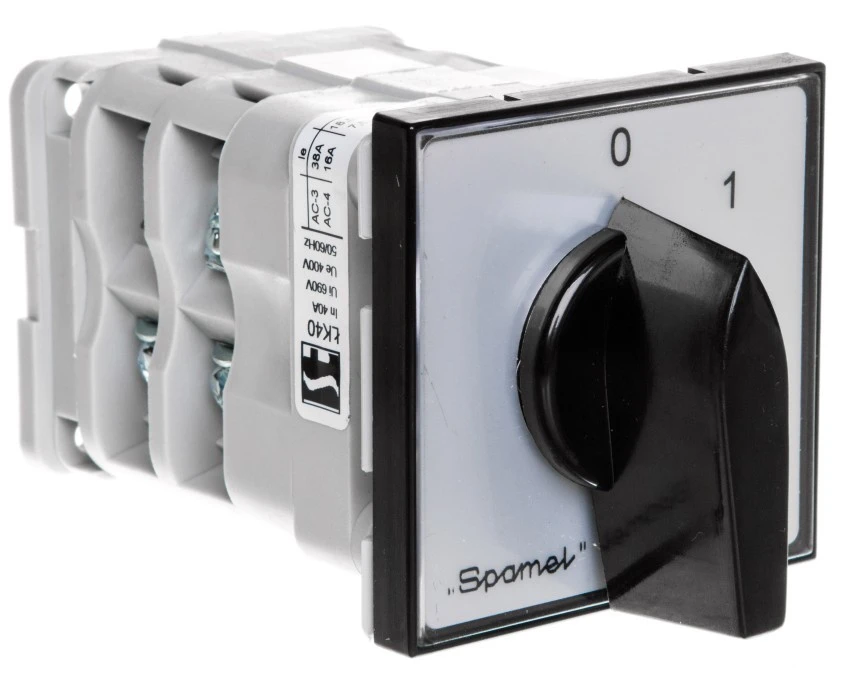 4. Łącznik krzywkowy 40A, Łącznik obwodów 0-1-2-3, mocowany do pulpitu czoło szare pokrętło czarne ŁK40-2.8445P03 124.81