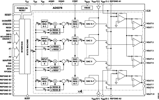 The AD5378 contains 32 14-bit DACs in one CSPBGA ...
