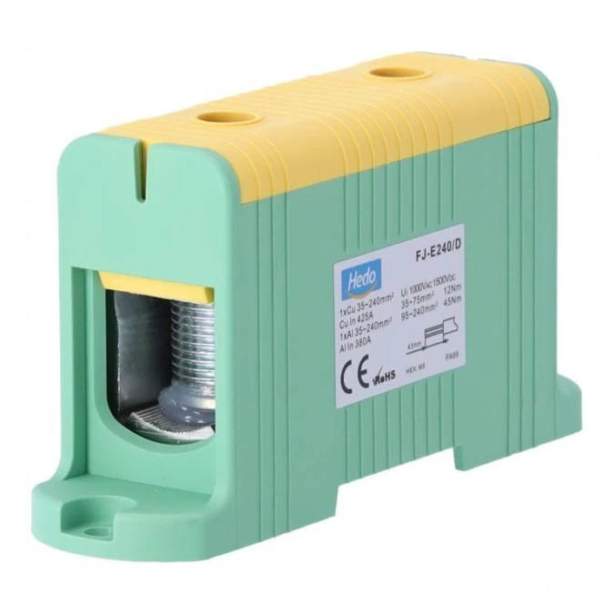 Blok rozdzielczy odgałęźny Al/Cu 35-240mm2 (max. 240mm2) na szynę TH35 żółto-zielony FJ-E240/D HEDO