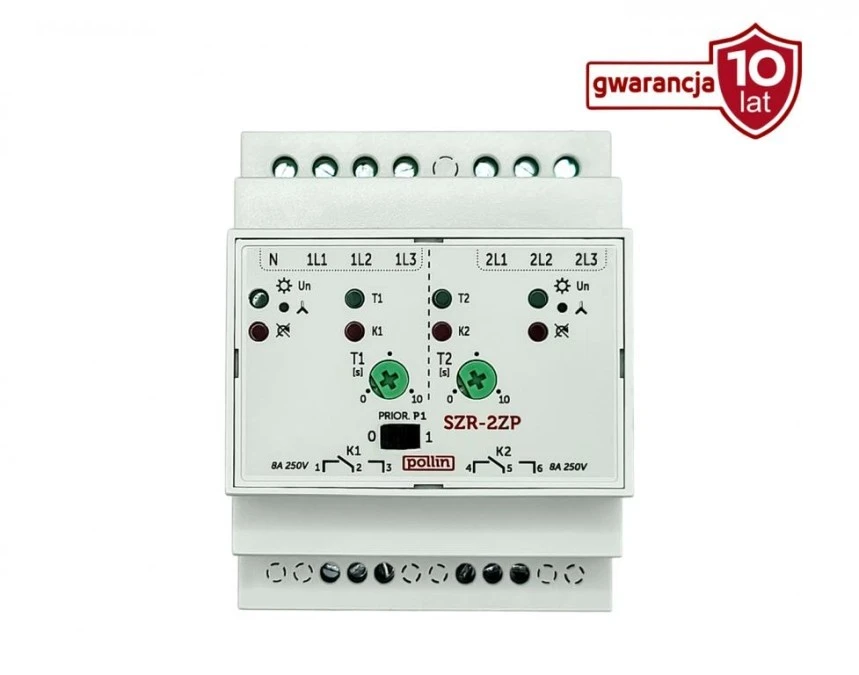Sterownik układu SZR, 3P, styki 2P, regulacja czasu przerwy przełączania 0,1 - 10s, ustawiany priorytet sieci podstawowej SZR-2Z