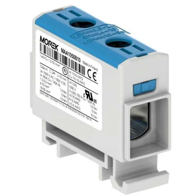 10. Złączka szynowa 1-torowa Al/Cu 1,5-50mm2 160A 1500V na TH35 niebieski OTL50 MOREK 22.09