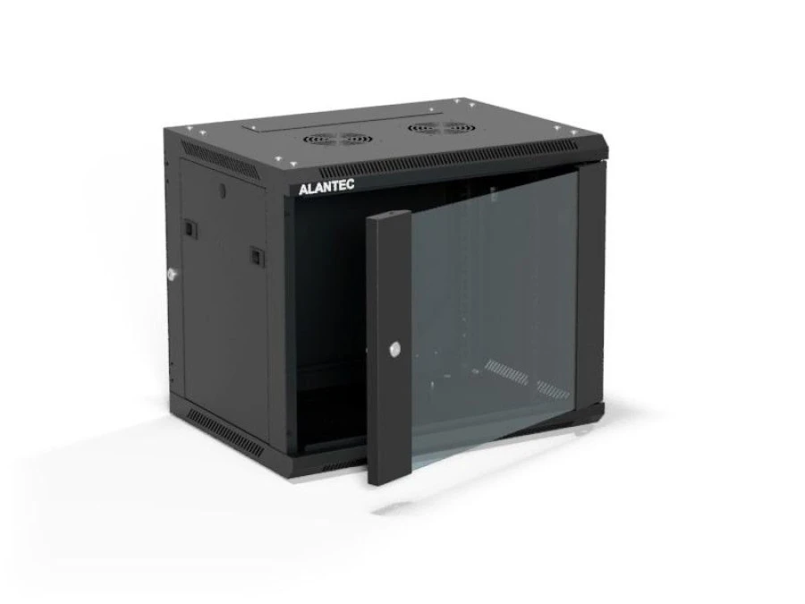 Szafa rack wisząca 19 cali 9U 600x450, drzwi szklane, tył i osłony boczne demontowalne, ZŁOŻONA kolor czarny ALANTEC