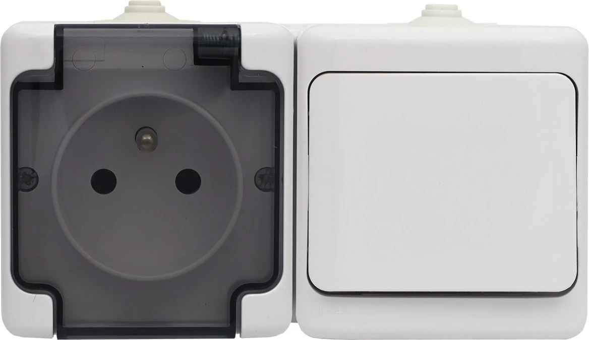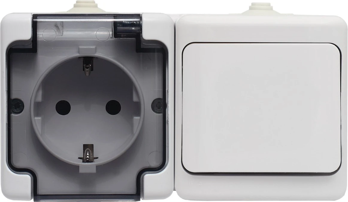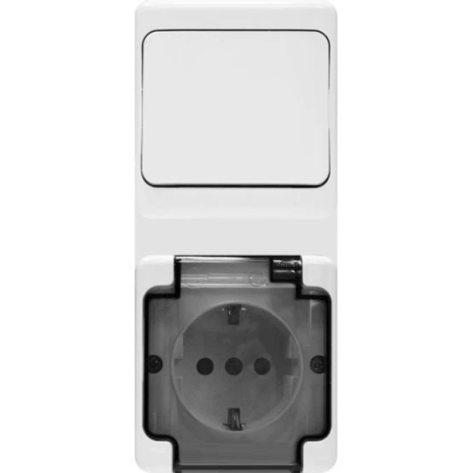 BRYZA Łącznik pojedynczy + gniazdo pojedyncze z/u Schuko IP54 z klapką dymną białe 181469