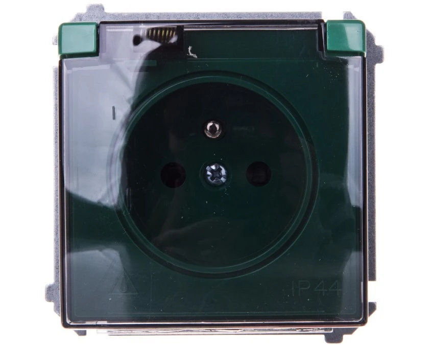 12. Simon Basic Gniazdo bryzgoszczelne z/u IP44 z przesłoną torów i klapką dymną zielone BMGZ1Bz.01/33a 34.08