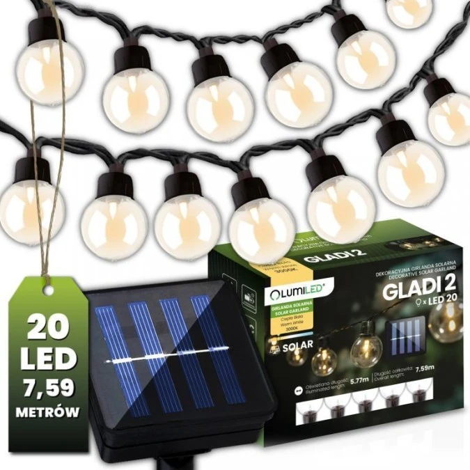 Girlanda Solarna Ogrodowa 20x LED Ozdobne Kuleczki 7,5m Ciepła 3000K GLADI 2 LUMILED