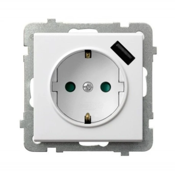 SONATA Gniazdo pojedyncze z uziemieniem z przesłonami torów prądowych, z ładowarką USB biały mat GP-1RZPUSB/m/75