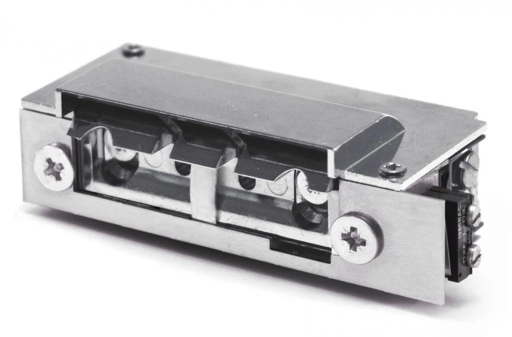 Elektrozaczep Hartte XS00UWM-C niskoprądowy wąski z wyłącznikiem, monitoringiem i wyślizgiem oraz uniwersalnym zasilaniem 12-24V