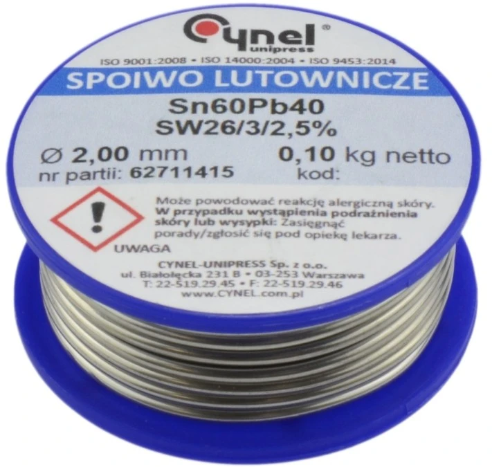 15. CYNEL UNIPRESS Cyna 2,00mm 100g Sn60Pb40 SW26/3/2.5 spoiwo lutownicze PROFESSIONAL 41.08