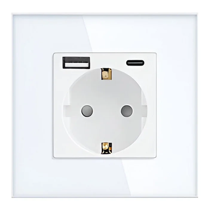 Gniazdo elektryczne pojedyncze Schuko z USB A+C 20W - szklana ramka - białe - Tawoia Glass