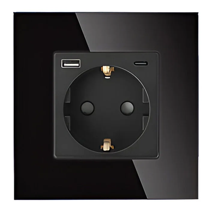 Gniazdo elektryczne pojedyncze Schuko z USB A+C 20W - szklana ramka - czarne - Tawoia Glass