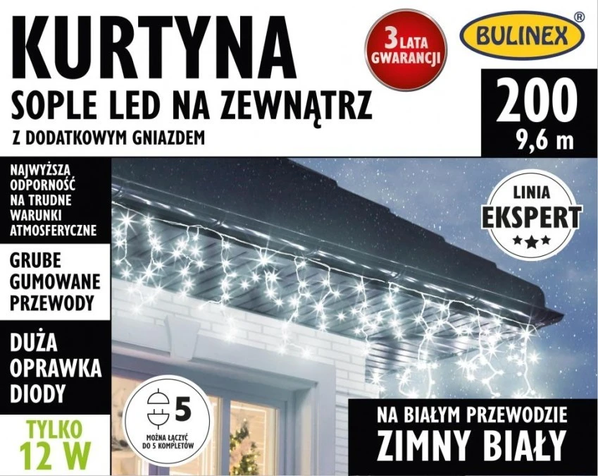 Kurtyna świetlna zewnętrzna 200l sople z dod.gniazdem 10m +1,5m przewodu zasilającego przewód biały barwa światła biała 75-664