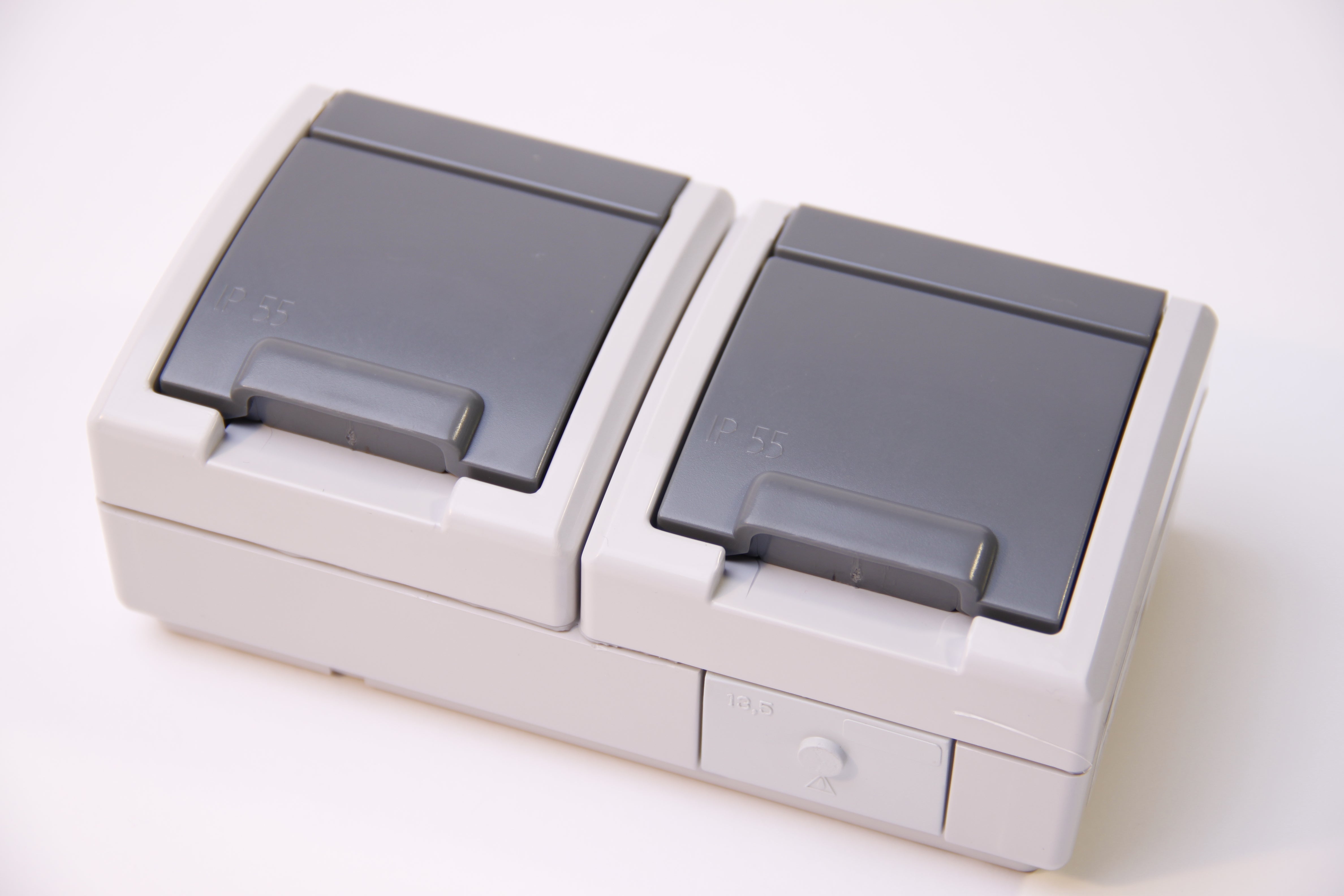 13. Gniazdo zasilające podwójne natynkowe hermetyczne IP55 szare z klapką 2x [2P+Z] 16A Aquant 2K 48.13