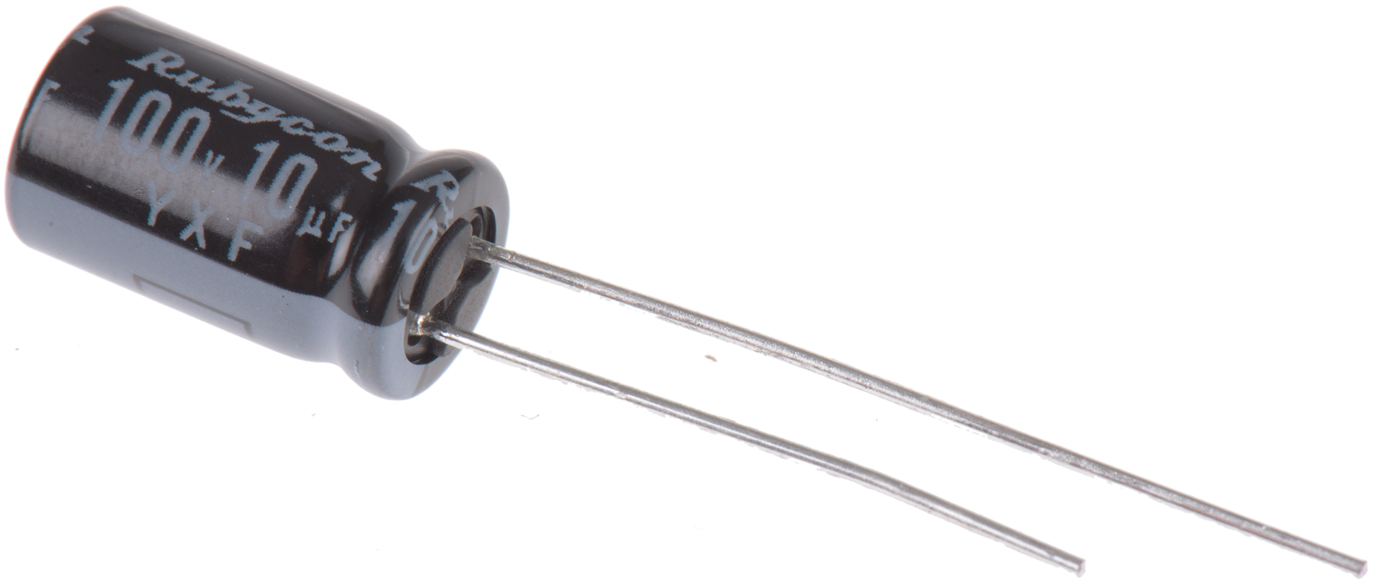 10. Kondensator 10μF 100V dc Radialny, Otwór przelotowy Rubycon roztaw: 2.5mm 6.3 (Dia.) x 11mm 2.20 x5