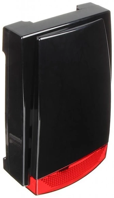Sygnalizator zewnętrzny w czarnej obudowie, optyczno-akustyczny, diody LED, światło czerwone, przetwornik piezoelektryczny, 115d