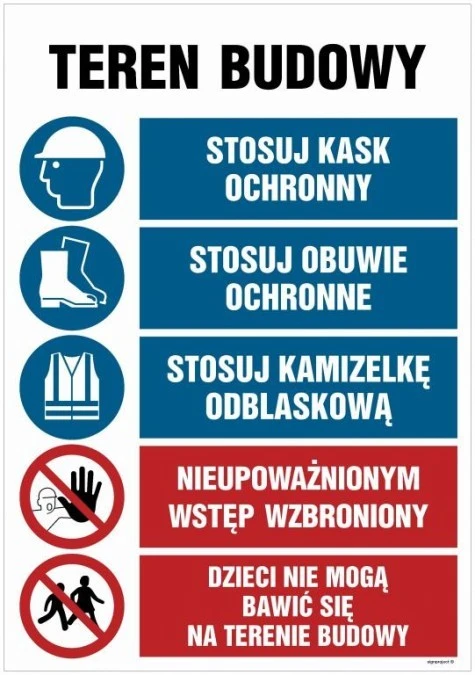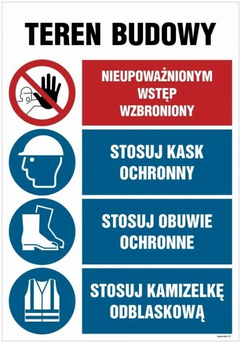 ZNAK - OI006 Teren budowy, Stosuj kask ochronny, Stosuj obuwie ochronne, Stosuj kamizelkę odblaskową, Nieupoważni 70 x 105 cm PN
