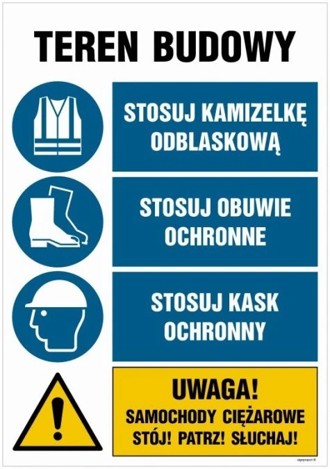 ZNAK - OI001 Teren budowy, Stosuj kask ochronny, Stosuj okulary ochronne, Stosuj kamizelkę odblaskową, Stosuj obu 70 x 105 cm PN