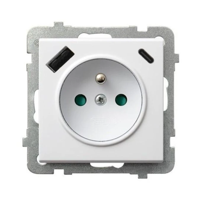 SONATA Gniazdo pojedyncze z uziemieniem z przesłonami torów prądowych, z ładowarką USB A+C biały mat GP-1RZPUSBAC/m/75