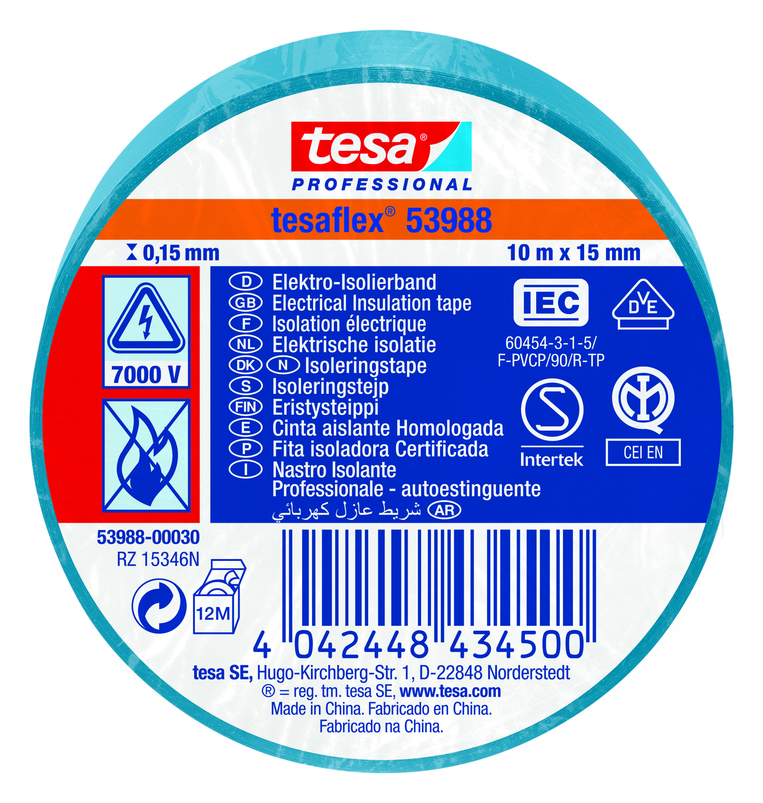 12. Taśma izolacyjna Niebieski szerokość: 15mm grubość: 150mm długość: 10m Miękki PVC 7000V Tesa 3.94