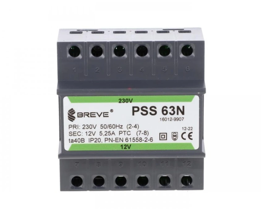 12. Transformator 1-fazowy modułowy bezpieczeństwa PSS 63N 230/ 12V 5,25A, na szynę DIN, IP20, Ta 40, 16012-9907 210.32
