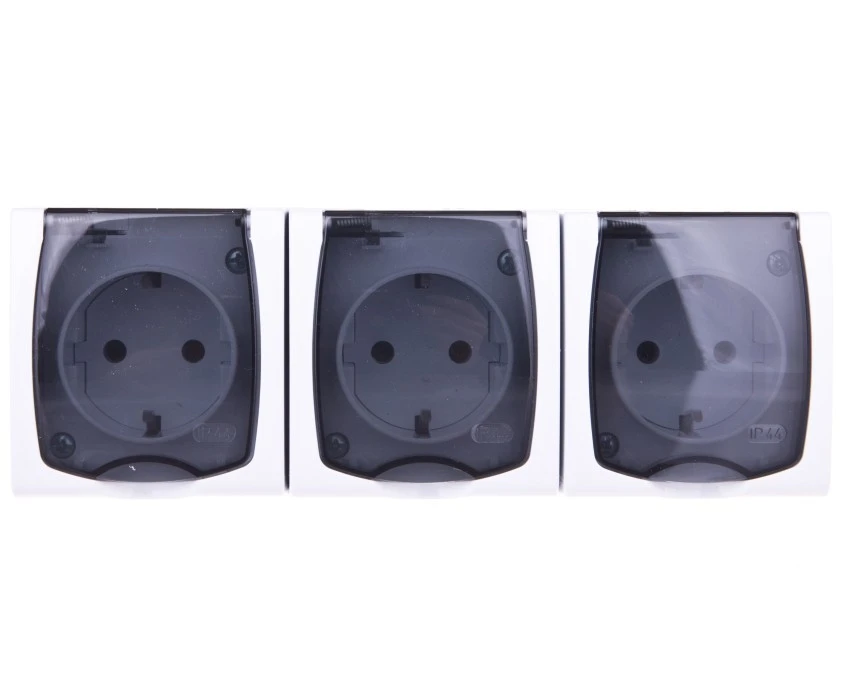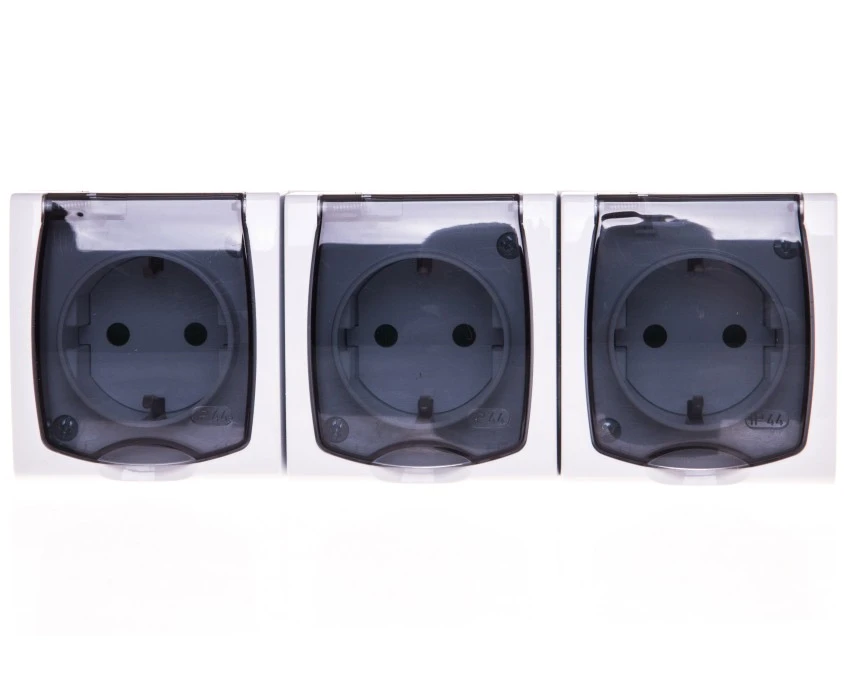 10. MADERA Gniazdo hermetyczne potrójne z/u Schuko IP44 z przesłonami klapka przezroczysta białe GNH-3NSP/00/d 61.06