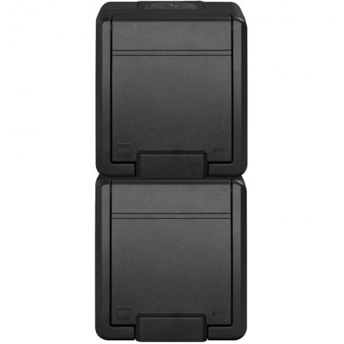 14. Gniazdo zasilające podwójne natynkowe hermetyczne IP55 antracytowe z klapką 2x 2P+Z z przesłonami, pionowe Aquant 2K 67.06