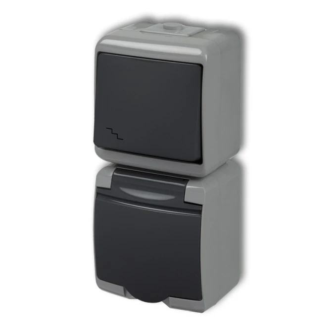 JUNIOR IP54 Wyłącznik pojedynczy z gniazdem pojedynczym z uziemieniem (klapka grafitowa: przesłony torów prądowych) popielaty /