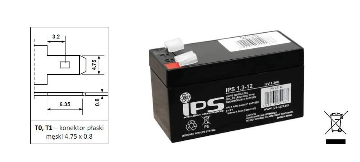 Akumulator VRLA AGM 12V 1,3Ah (żywotność 6-9lat) IPS 1.3-12