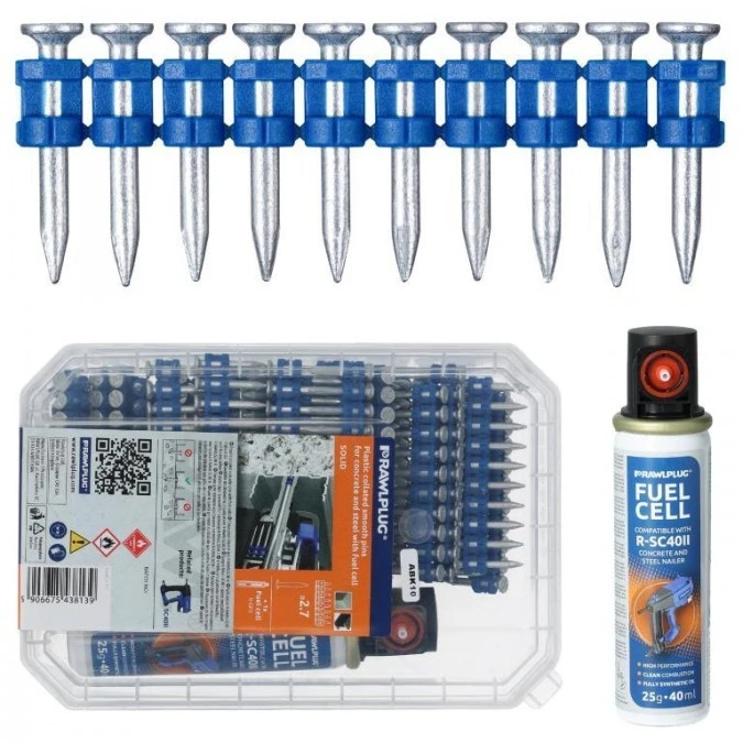 8. Gwoździe do betonu 2,7x25mm ocynkowane, gładkie łączone plastikiem 500 sztuk + 1x gaz do osadzaka R-SC40II Rawlplug R-KNC-6/25/5 101.35