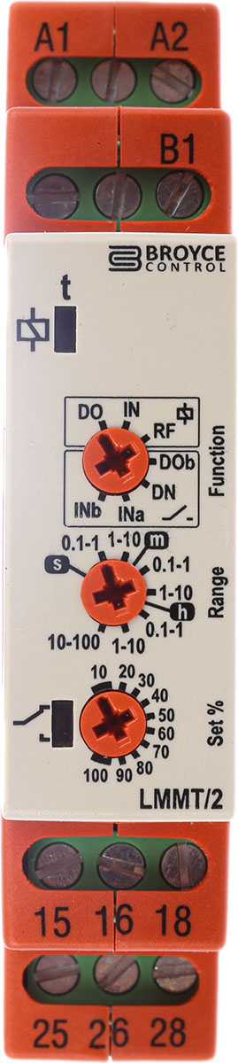 Timer Relay Szyna DIN 24 → 230 V ac/12 → 230V dc DPDT 2-stykowy Broyce Control DPDT 0.1 s → 100h