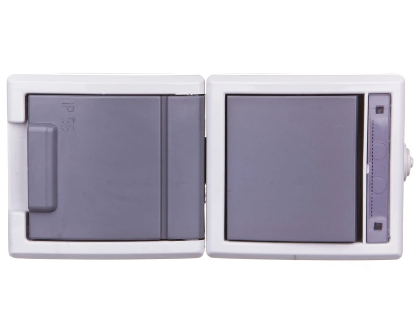 4. AQUANT Gniazdo hermetyczne nt. pojedyncze z/u + łącznik schodowy jednobiegunowy z klapką pełną/szarą 16A 250V IP55 szare 1256-10 61.29