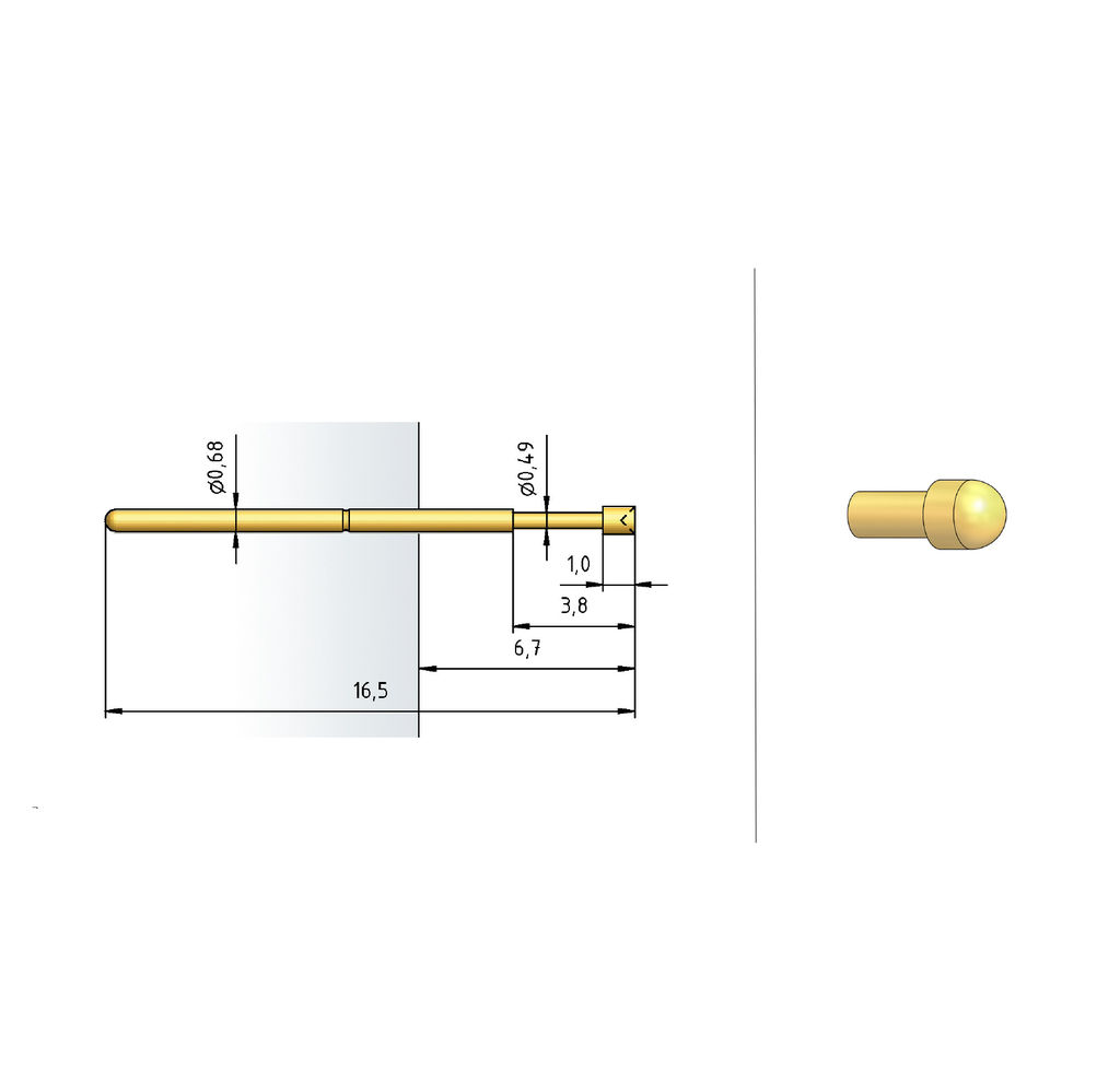 8. Standard spring contact with probe, round head, Ø 0.68 mm, travel  2.8 mm, pitch 1.27 mm, L 16.5 mm, 1007-A-0.7N-AU-0.9 30.42