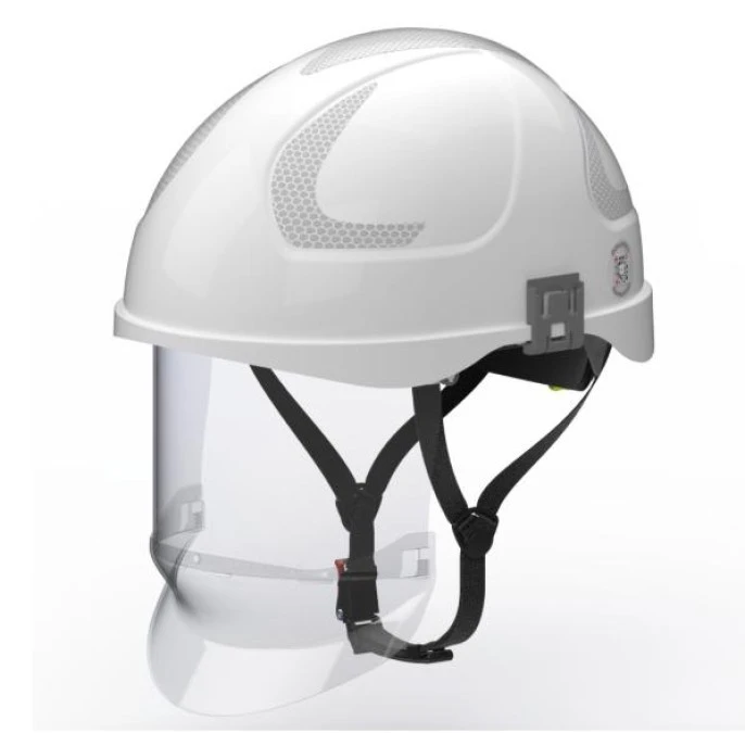 Hubix Biały hełm elektroizolacyjny z osłoną twarzy (ruchomą) W1 klasy 1 Box‑test, do 20 kV AC / 1,5 kV DC SECRA H058S