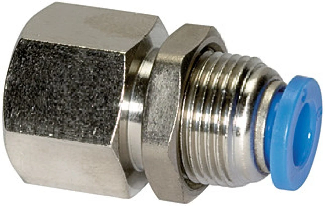 11. Złączka pneumatyczna wtykowa grodziowa R 1/4 GW do węża fi 4 mm, mosiądz niklowany 7.36