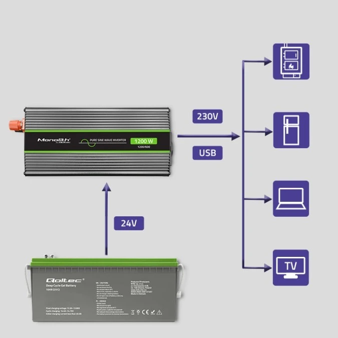 9. Qoltec Przetwornica Napięcia Monolith 600W 1200W 24V Na 230V Czysty Sinus 263.21