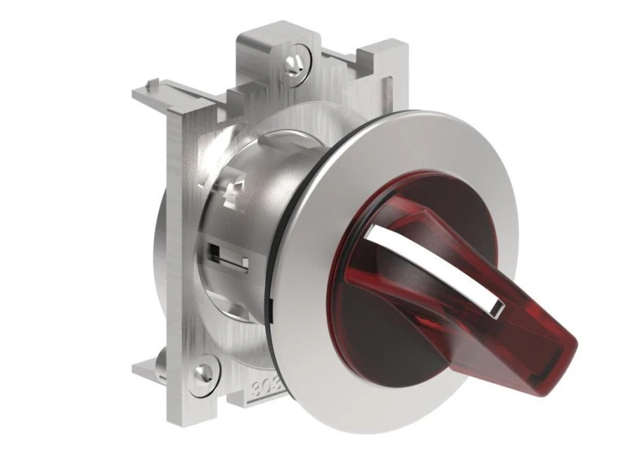 6. Metalowy przełącznik płaski podświetlany 3 pozycyjny 1-0-2 z samopowrotem z 1 do 0 fi 30mm pokrętło krótkie Czerwony LPFSL1324 174.64